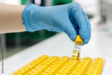 A healthcare worker removes the vial of virus from the biosafety cabinet for further analysis. The concept of precise handling and safety when handling medical samples under sterile conditions.