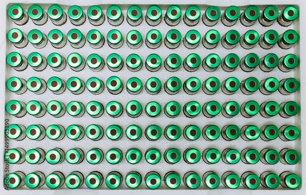 Ampoules with green caps neatly arranged in a safety box on a sterile lab surface. Concept production of injectable drugs with strict hygiene standards and cleanliness control.