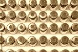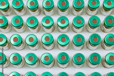 A large number of ampoules with green caps arranged in a box on a white background. Concept organization and storage of medical substances in a sterile laboratory environment.