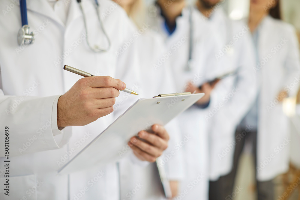 Professional doctor wearing uniform taking notes in clipboard journal, physician therapist with stethoscope, practitioner filling medical documents, new patient form, illness history, prescription