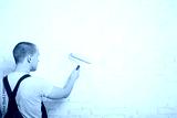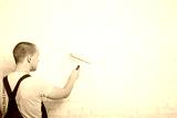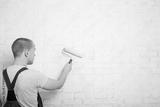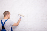 back view of young man painter in workwear painting brick wall with paint roller and copy space