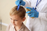 Female doctor with remedy brushing little boy's hair for pediculosis on beige background, closeup
