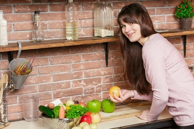 A woman in the kitchen is standing near a table with fresh vegetables holding an orange