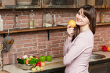 A woman in the kitchen is standing near a table with fresh vegetables holding an orange