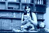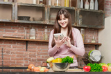 woman is making online shopping by tablet computer . Housewife found new recipe for cooking in a kitchen