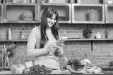 Woman uses a tablet for online shopping and searching for recipes in the kitchen.