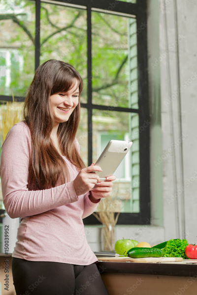 Woman uses a tablet for online shopping and searching for recipes in the kitchen.