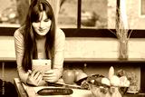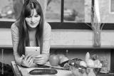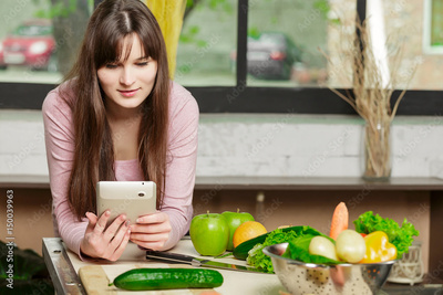 Woman uses a tablet for online shopping and searching for recipes in the kitchen