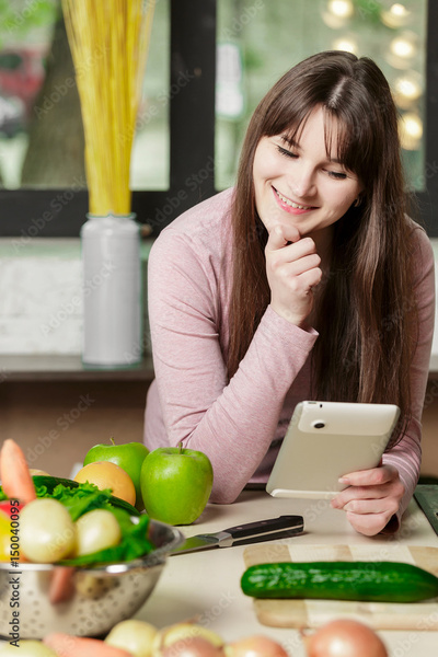 Woman uses a tablet for online shopping and searching for recipes in the kitchen