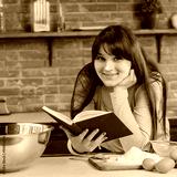 A woman prepares food in the kitchen and reads cooking recipes in the book.