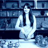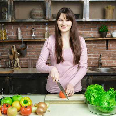 Young woman cutting vegetables using knife and cooking board. She is preparing fresh meal in the kitchen.