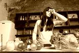 A woman cuts a cucumber in the kitchen with a knife. Preparation of salad.Woman tired cooks, clings to the head