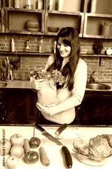 Woman holding a paper bag with fresh vegetables in the kitchen