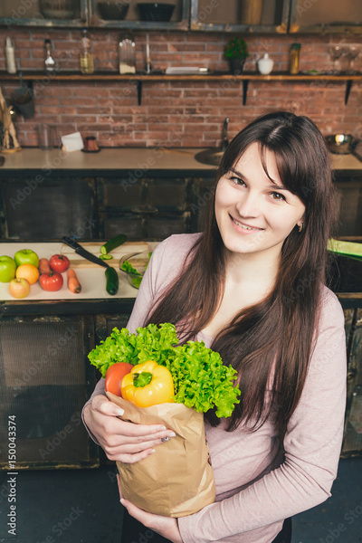 Woman holding a paper bag with fresh vegetables in the kitchen