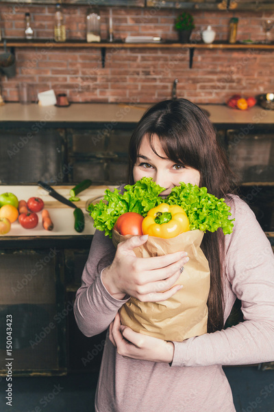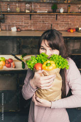 Woman holding a paper bag with fresh vegetables in the kitchen
