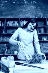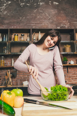 A woman in the kitchen prepares dietary food and speaks on the phone.
