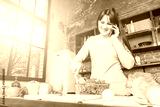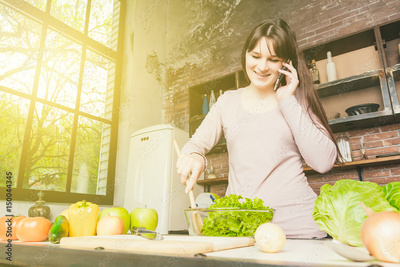 A woman in the kitchen prepares dietary food and speaks on the phone.