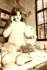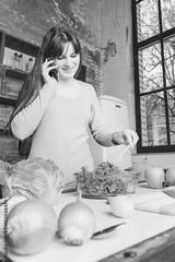 A woman in the kitchen prepares dietary food and speaks on the phone.