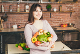 Portrait of happy young woman holding of fresh organic vegetables