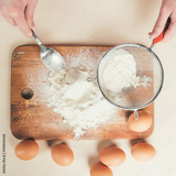 Women's hands close-up on top sift flour through a sieve on the kitchen table.