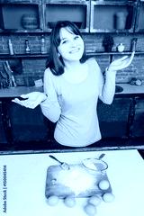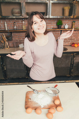 Young cheerful woman in the kitchen near the table with eggs, flour.
