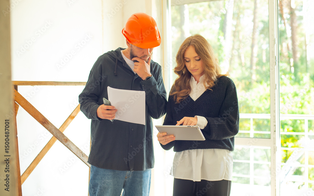 architect-designer and foreman-engineer at a construction unfinished renovated site discuss inspect plan calculate use tablet