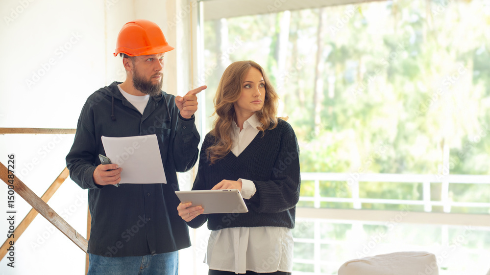 architect-designer and foreman-engineer at a construction unfinished renovated site discuss inspect plan calculate use tablet