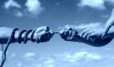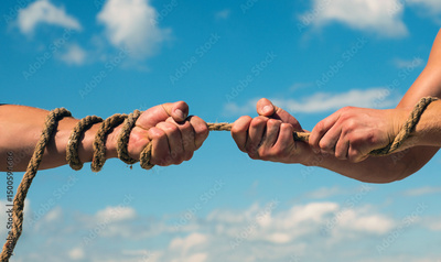 Conflict or tug. Two hands, helping hand, arm, friendship. Rope, cord. Hand holding a rope, climbing rope, strength and determination. Rescue, help, helping gesture hands. Helping hand support concept