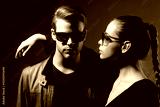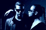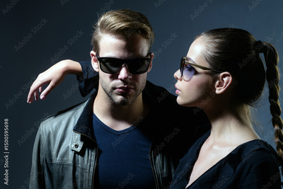 Fashion couple wearing sunglasses. Stylish man and woman with sunglasses posing in studio. Young friends in fashion shoot. Fashion portrait of youth. Fashion models with classic sunglasses. Vogue