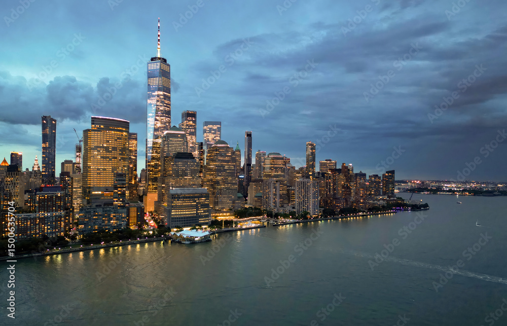 New York City an sky with clouds. NYC cityscape with skyscrapers. Aerial panorama of New York City skyline. Manhattan skyline. New York and Hudson River. Downtown NYC. New York skyscrapers from top.