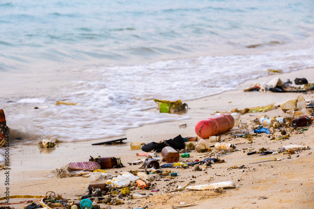 Plastic waste, plastic cups at the beach. Concept of environmental problems and saving the plane