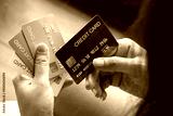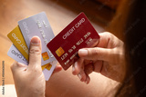 Woman holding credit cards and he is choosing a credit card to pay and spend Payment for goods via credit card. Finance and banking concept