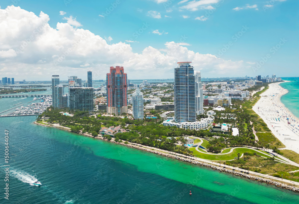 Aerial view of Miami Beach with turquoise waters. Drone shot of Miami skyline. Top view of South Miami Beach. Miami cityscape with luxury skyscrapers and ocean. View of Miamis famous skyscrapers.