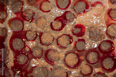 Cherry sauce forms a colorful, textured mosaic in a gourmet arrangement