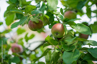 Red and green apples hang among vibrant leaves in a sunny orchard, displaying nature's bounty