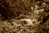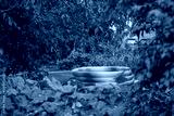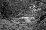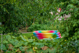 A colorful inflatable pool rests among lush plants and trees on a warm day