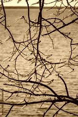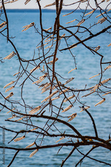Delicate seed pods dangle from bare branches by serene blue waters at sunrise