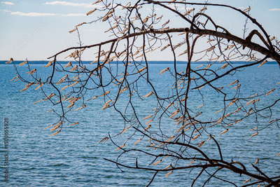 Delicate branches with budding leaves stretch over calm waters, reflecting spring's awakening