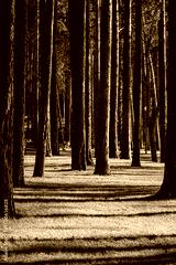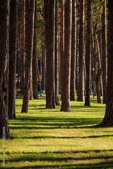 Soft sunlight warms the forest, revealing tall trees and a serene green meadow with wanderers
