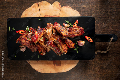 Juicy grilled ribs are artfully arranged with garlic and chili peppers on a wooden serving platter