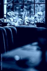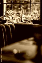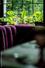 Colorful plants adorn the window, creating a warm and inviting atmosphere for visitors