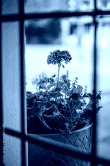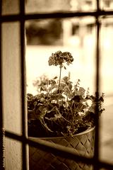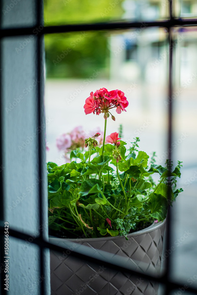 Bright pink geraniums flourish in a stylish planter, bringing life to the tranquil outdoor view