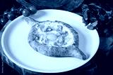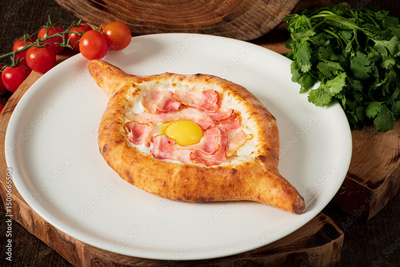 A delicious khachapuri on a wooden table, topped with cheese, ham, egg, and herbs