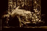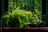 Ferns and small plants thrive by a window, basking in sunlight while a few red flowers add color