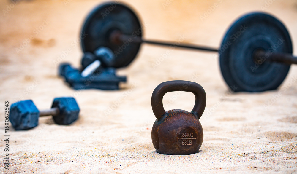 Sports equipment. Kettlebell, barbell and dumbbells for summer sport. Outdoor sport. Fitness workout in public sport gym. Lifting weights. Healthy lifestyle. Fitness outdoors. Sport background.