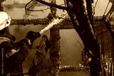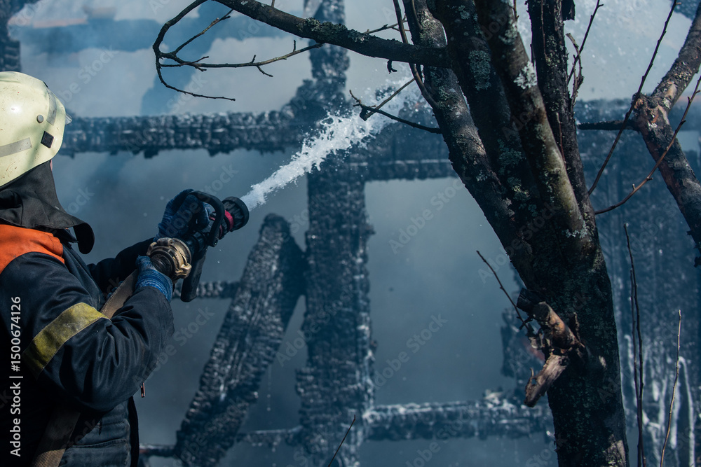 Firefighter put out a fire. Brave firefighter battling house blaze. Firemen in uniform near burning home. Firefighter uses hose to control fire. Firefighting concept. Firefighter in helmet on flame.