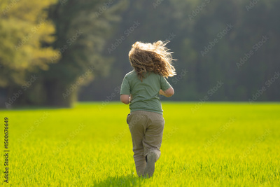 Child running in autumn field. Excited kid run outdoors. Child on nature. Child in run motion on grass. Kid running at park. Teen running in meadow. Portrait of running child.