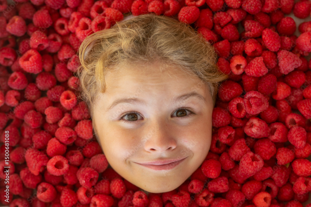The kids face with raspberries fruit and berries. Summer, pink red raspberry background.