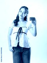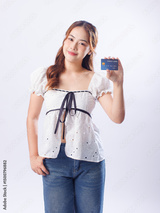 Asian young beautiful woman cheerful smile long curly hair wearing white puff sleeve blouse blue jean holding showing pointing credit card for shopping online transactions payment on white background