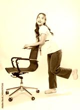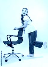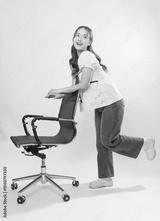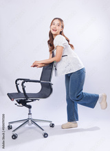 Portrait asian young beautiful woman cheerful confident long curly wavy hair wearing white puff sleeve blouse blue jeans, standing posing with office chair smile look at camera on white background.